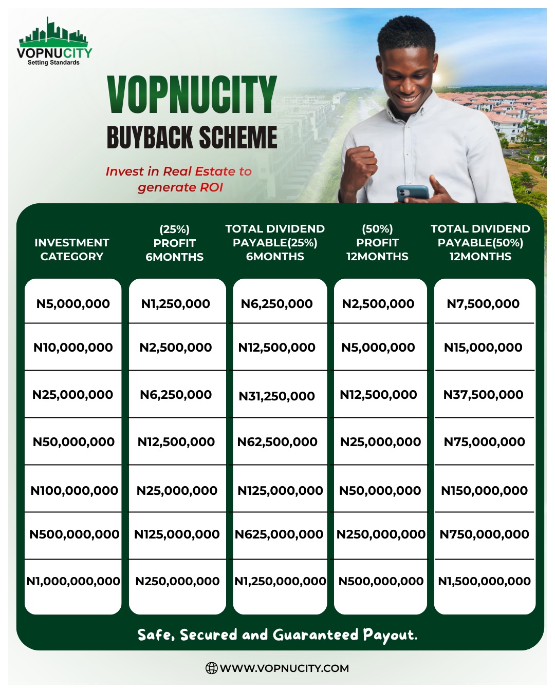 Real estate remains one of the safest and most profitable ways to build long-term wealth. With the Vopnucity Buyback Scheme, you can invest in premium real estate and enjoy guaranteed returns on your investment within a short period of time.